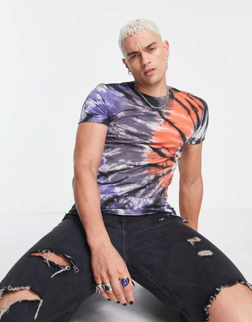 ASOS DESIGN – Lila och orange batikmönstrad t-shirt med muscle fit - GREY - GREY