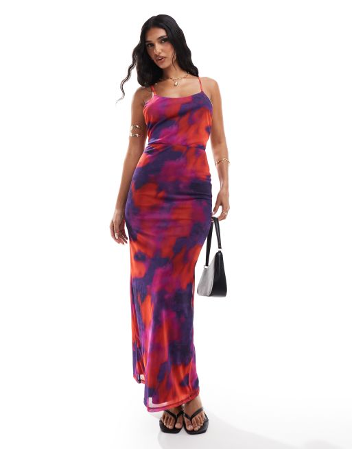 ASOS DESIGN – Lila, suddigt mönstrad maxiklänning i mesh med smala axelband och låg rygg