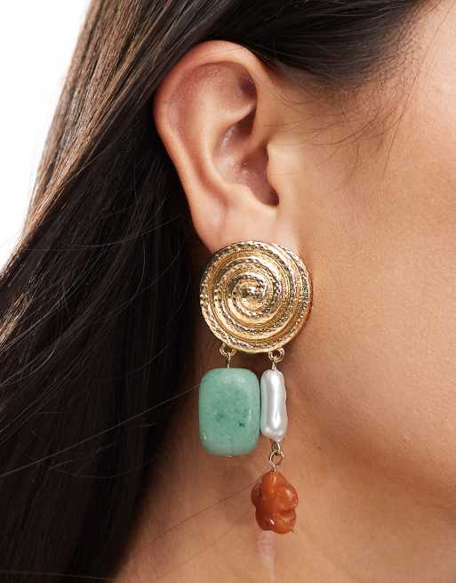 ASOS DESIGN – Limited Edition – Guldfärgade hängande örhängen med turkosa halvädelstenar och pärlimitationer
