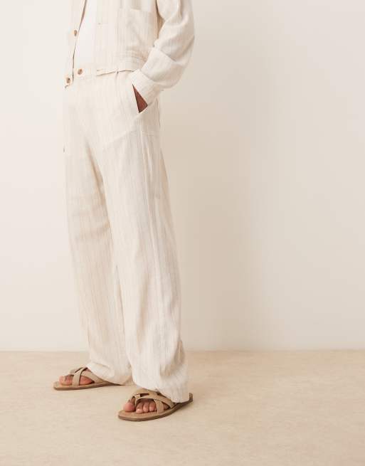 ASOS DESIGN – Ljusbeige, kritstrecksrandiga, uppklädda raka byxor i linnemix, del av set