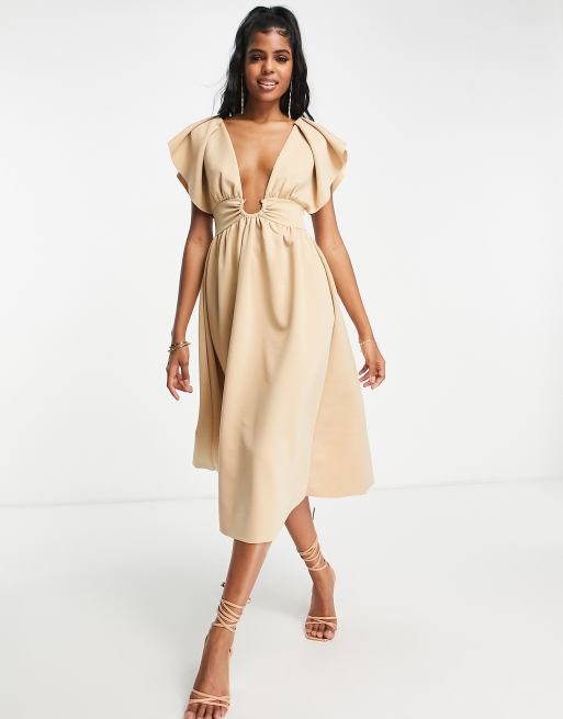 ASOS DESIGN – Ljusbeige mjuk balklänning i midilängd med volangärm och guldfärgad ring