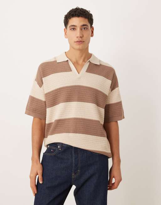 ASOS DESIGN – Ljusbeige och naturvit, randig, stickad pikétröja med avslappnad passform och sprund vid halsen