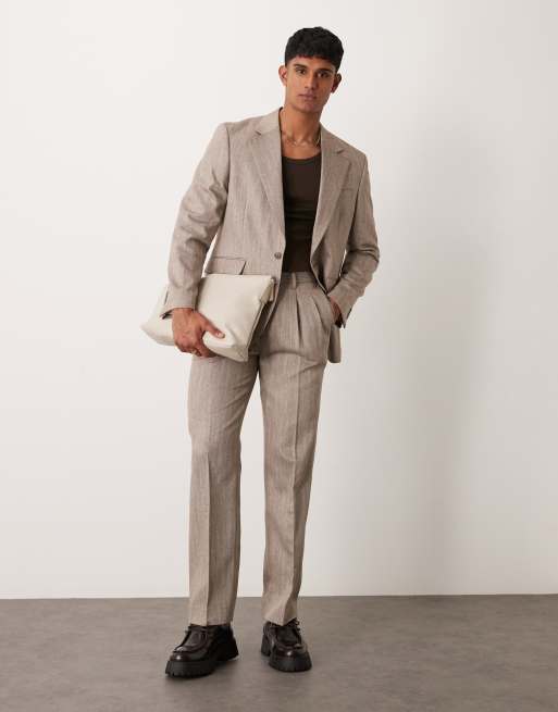 ASOS DESIGN – Ljusbrun, fiskbensmönstrad kostym i regular fit