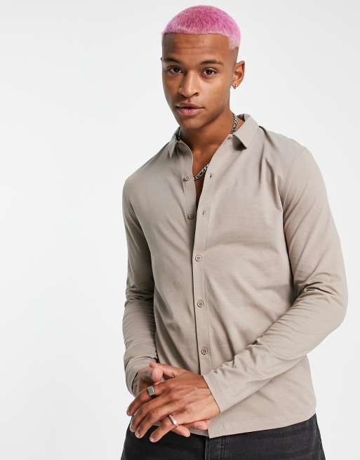 ASOS DESIGN – Ljusbrun jersey-skjorta med långa ärmar och knäppning