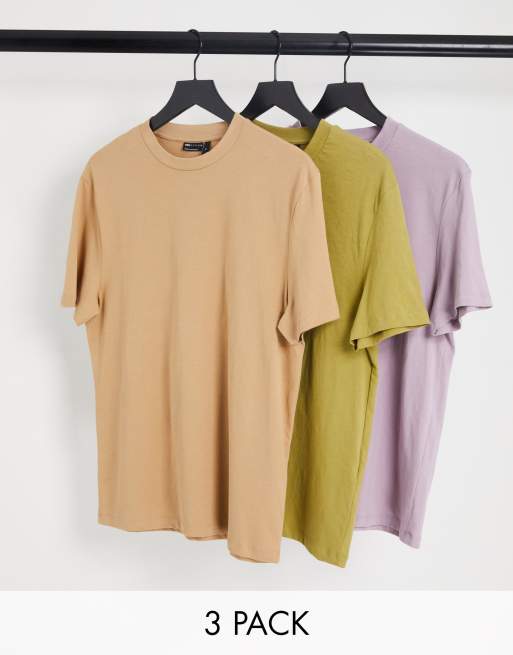 ASOS DESIGN – Ljusbrun, olivfärgad och ljuslila t-shirt med rund halsringning, 3-pack