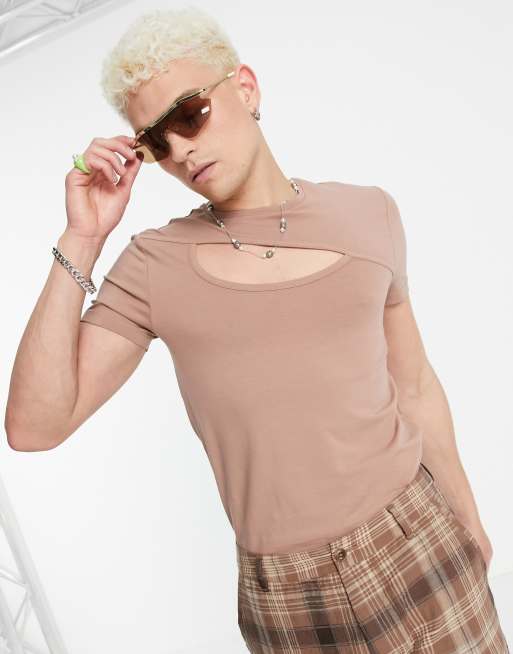 ASOS DESIGN – Ljusbrun t-shirt i muscle fit med utskuren detalj framtill