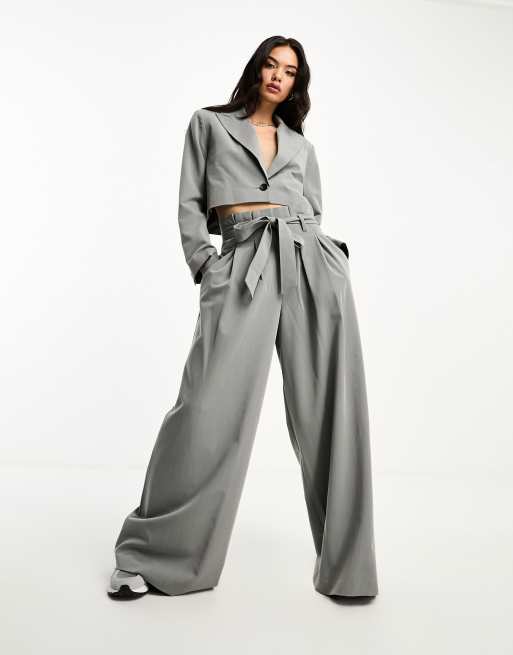 ASOS DESIGN – Ljusgrå byxor i paper bag-modell med skärp, del av set