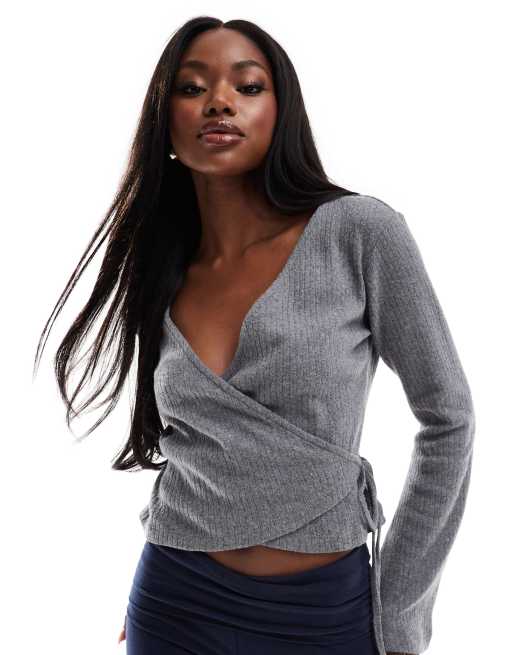 ASOS DESIGN – Ljusgrå, supermjuk, borstad kofta i omlottdesign