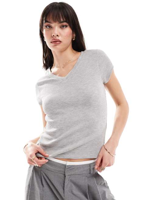 ASOS DESIGN – Ljusgrå, våffflad t-shirt med v-ringning, holkärm och smal passform