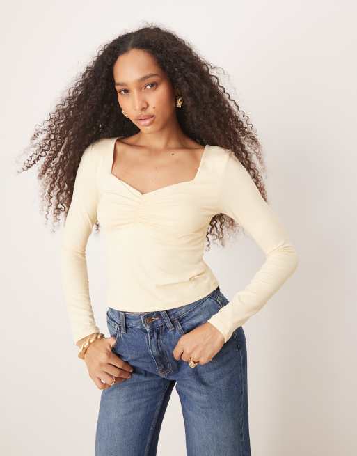 ASOS DESIGN – Ljusgul, åtsmitande topp i polyamid med långa ärmar och rynkad byst