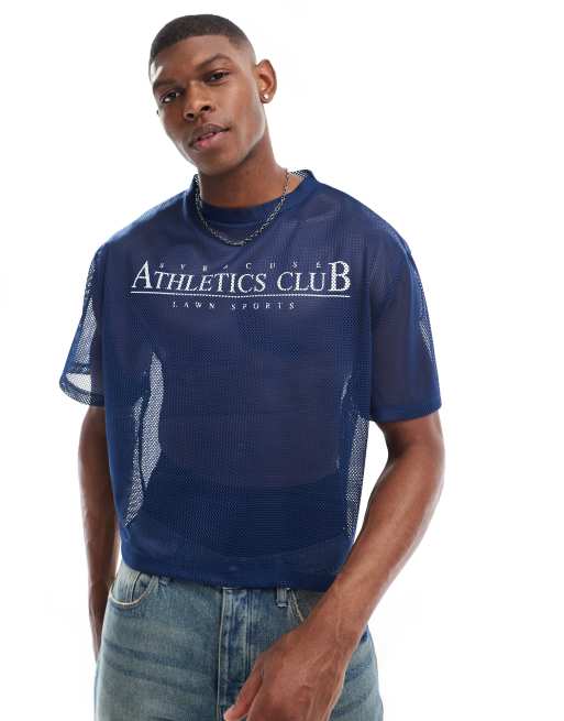 ASOS DESIGN – Marinblå, boxig, oversize t-shirt i sportig mesh med tryck framtill
