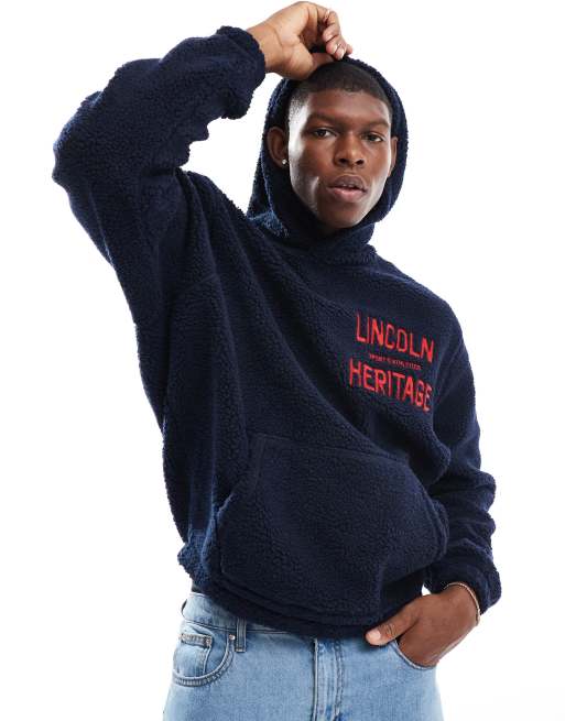 ASOS DESIGN – Marinblå huvtröja i teddy med tryck