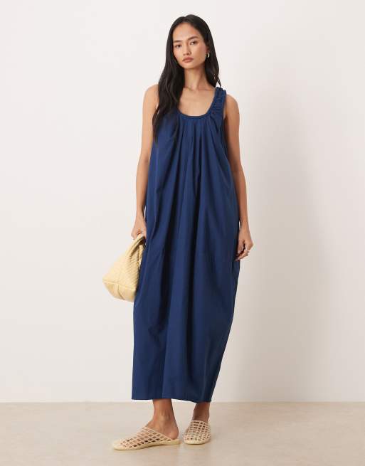 ASOS DESIGN – Marinblå maxiklänning med djup, rynkad halsringning i poplin