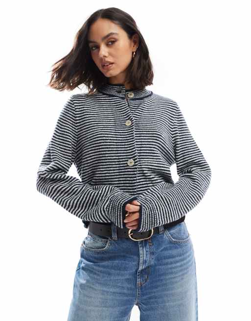 ASOS DESIGN – Marinblå och gräddvit, randig, stickad kofta i kort design med rund halsringning