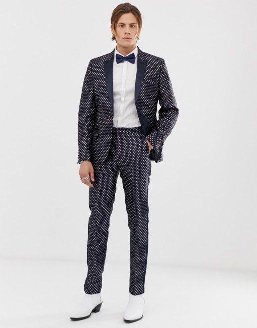 ASOS DESIGN – Marinblå smoking till balen i diamantmönstrad jacquard med extra smal passform