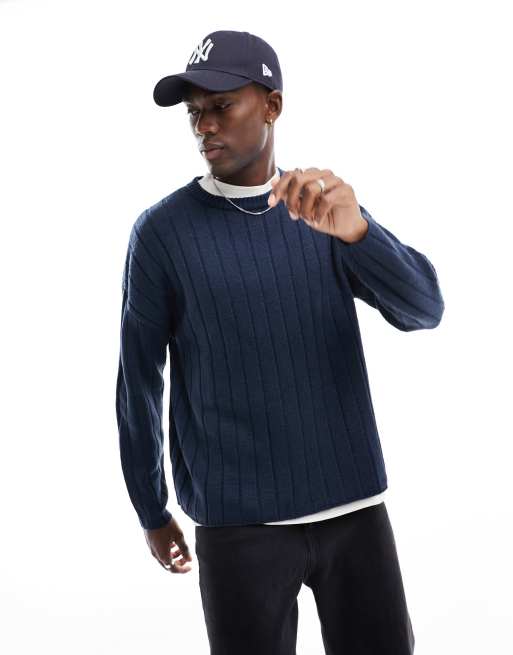 ASOS DESIGN – Marinblå, stickad, bredribbad tröja med rund halsringning i oversize