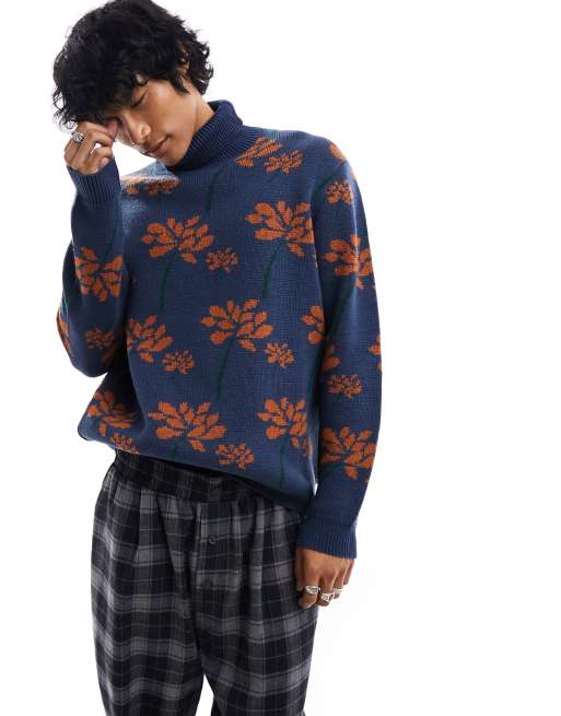 ASOS DESIGN – Marinblå, stickad tröja med polokrage och blommönster