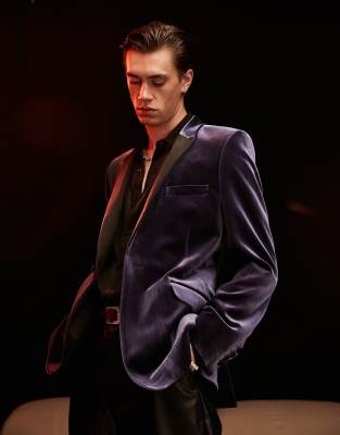 ASOS DESIGN – Marinblå supersmal sammetskavaj med kontrasterade slag
