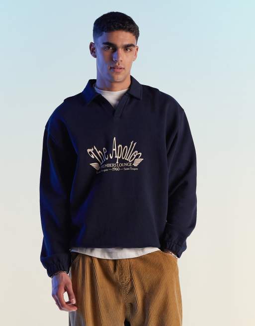 ASOS DESIGN – Marinblå sweatshirt i oversize med pikékrage och texttryck framtill
