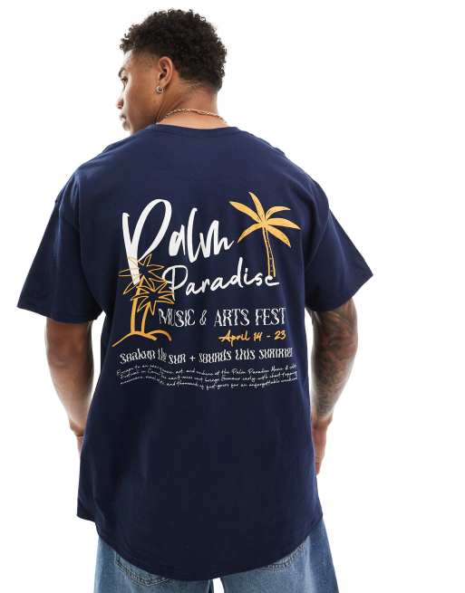 ASOS DESIGN – Marinblå t-shirt i oversize med Palm Paradise-tryck