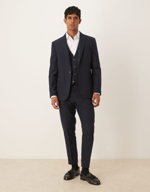 ASOS DESIGN – Marinblått, fiskbensmönstrad kostym i yllestil med smal passform