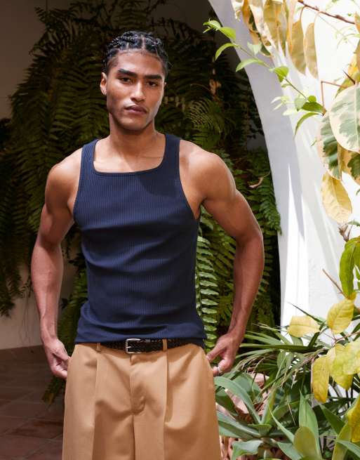 ASOS DESIGN – Marinblått, ribbat, kraftigt linne i muscle fit med fyrkantig ringning