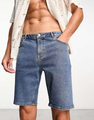 ASOS DESIGN – Mellanblå, extra smala jeansshorts i normallängd med tvättad finish