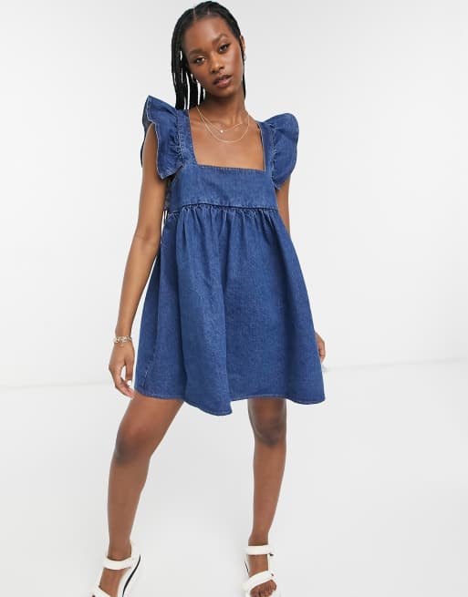 ASOS DESIGN – Mellanblå förklädesklänning i denim med volangärmar