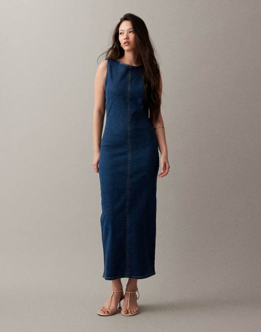 ASOS DESIGN – Mellanblå midiklänning i denim med bodycon-passform och rak halsringning