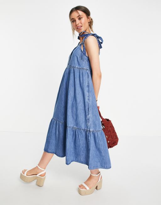 ASOS DESIGN – Mellanblå panelsydd midiklänning i mjuk denim