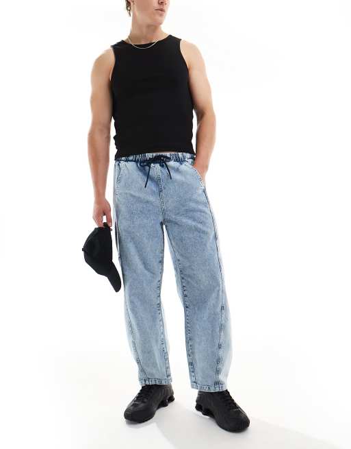 ASOS DESIGN – Mellanblå, tvättade jeans i oversize med elastisk midja och ADS-logga
