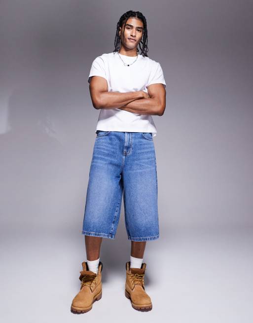 ASOS DESIGN – Mellanblå, tvättade jeansjorts i längre modell