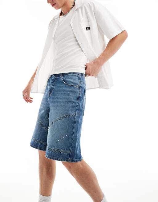 ASOS DESIGN – Mellanblå, tvättade, långa jeansshorts med paneler