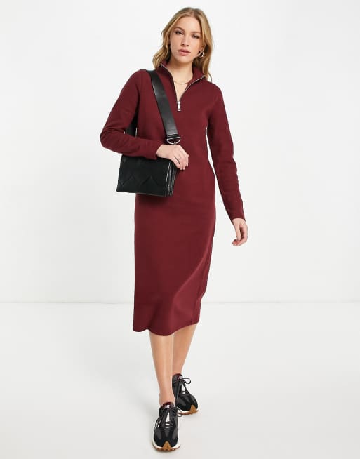 ASOS DESIGN – Merlotröd, supermjuk tröjklänning i midilängd med pikékrage och dragkedja vid halsen