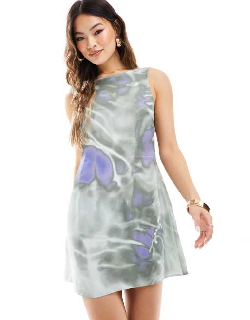 ASOS DESIGN – Miniklänning i satin med lågt skuren rygg och suddigt mönster