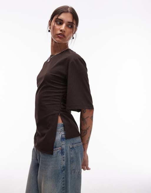 ASOS DESIGN – Mockabrun, kritstrecksrandig, figursydd t-shirt med markerad midja