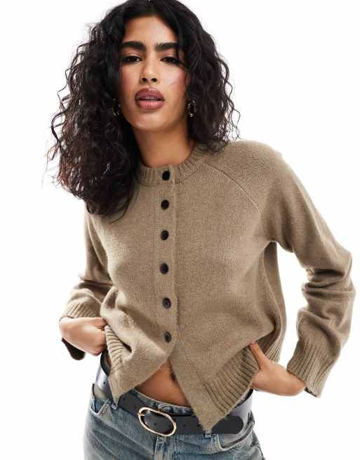 ASOS DESIGN – Mockabrun, stickad kofta med rund halsringning, slitsad fåll och kontrastfärgade knappar