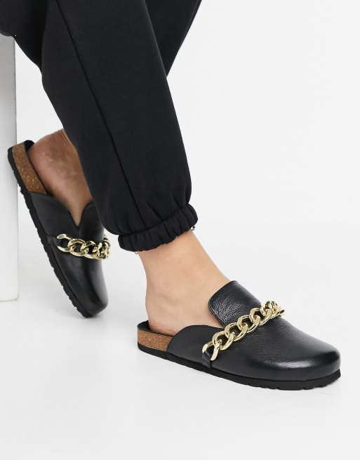 ASOS DESIGN – Molly – Svarta lädermules med gulddetalj