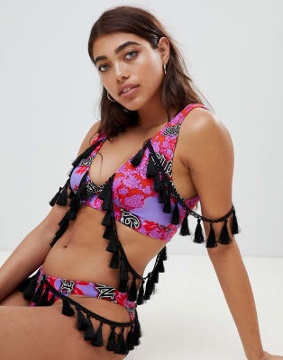 ASOS DESIGN – Mönstrad bikini med färgglada tofsar
