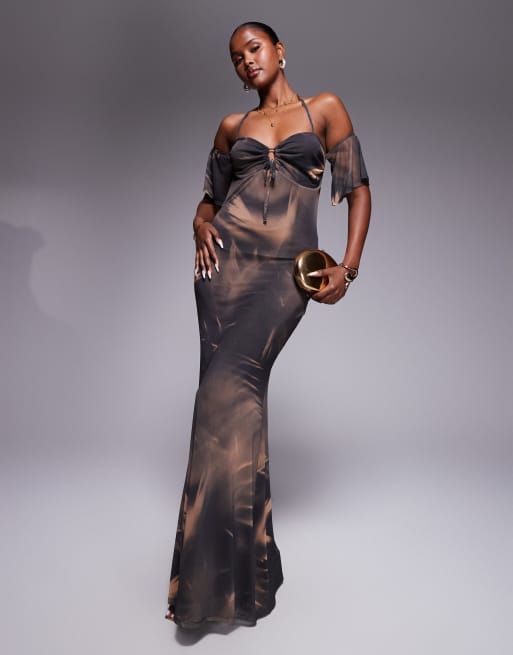 ASOS DESIGN – Mönstrad maxiklänning med bardotringning och vida ärmar