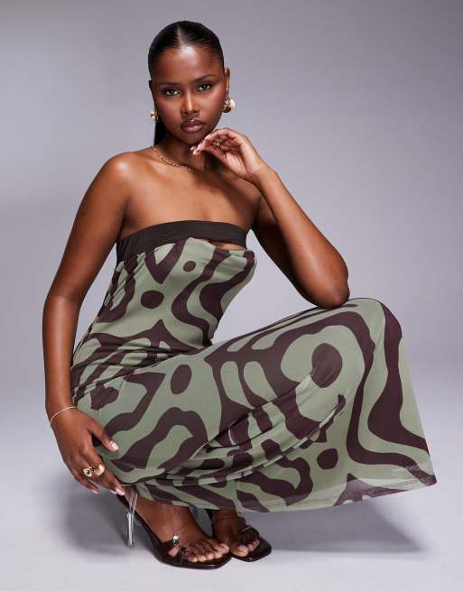 ASOS DESIGN – Mönstrad midiklänning med bandeauringning, kontrastkrage och draperad detalj