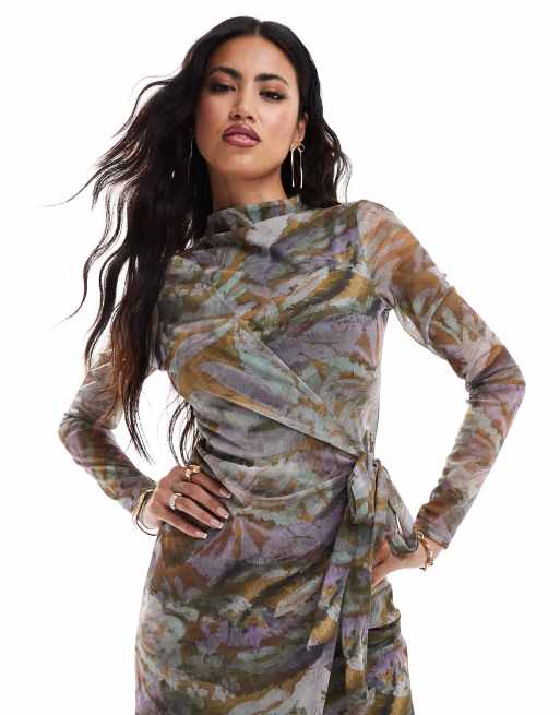 ASOS DESIGN – Mörk, blommig maxiklänning med hög krage och omlottdetalj