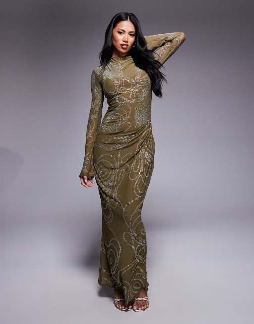 ASOS DESIGN – Mörk olivgrön maxiklänning med värmefixerat konstverk, långa ärmar och ryschad kjol