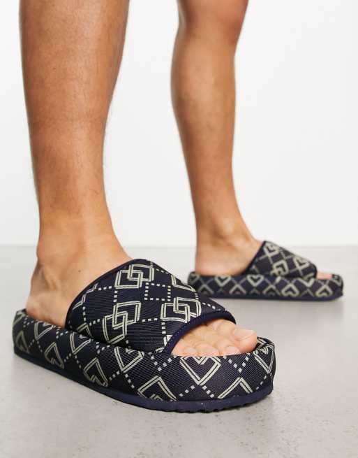 ASOS Design– Mörkblå, grova tofflor i textil med monogram
