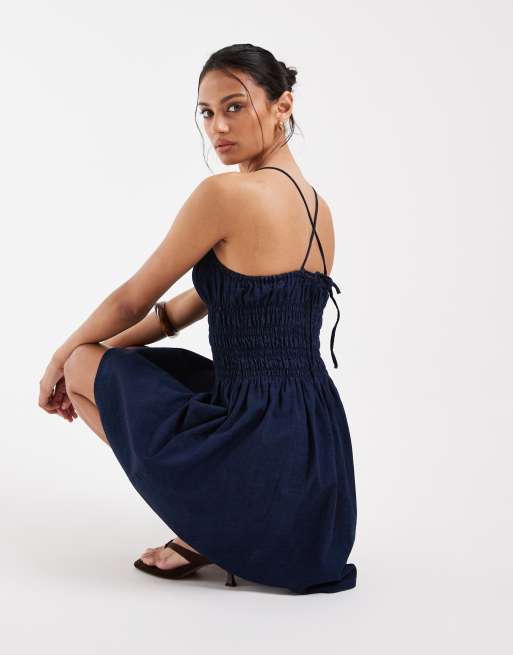ASOS DESIGN – Mörkblå, smockad miniklänning i denim