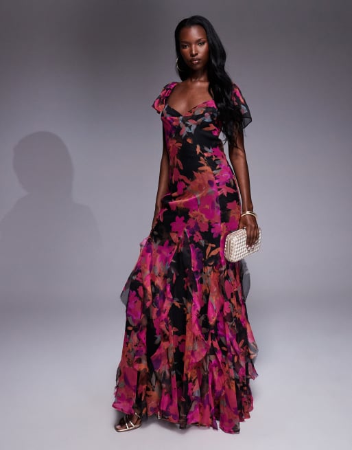 ASOS DESIGN – Mörkblommig maxiklänning med utsvängd ärm och klockad kjol med volang