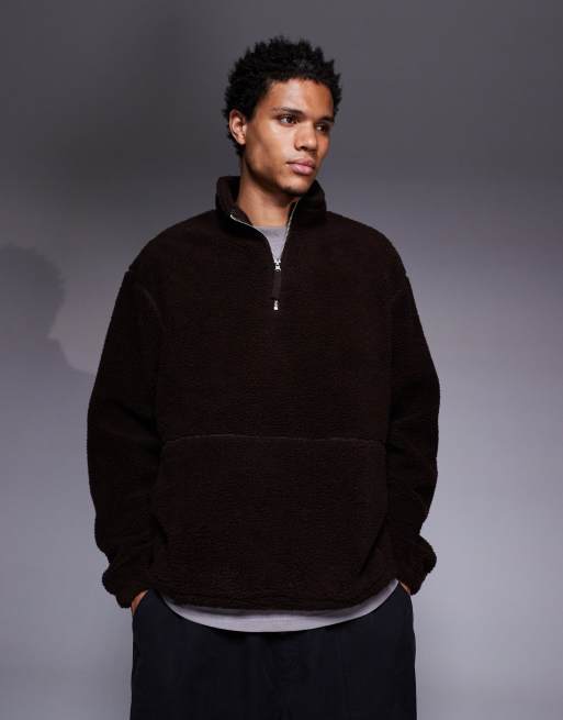 ASOS DESIGN – Mörkbrun, avslappnad sweatshirt med ståkrage och kort dragkedja i halsen i teddy