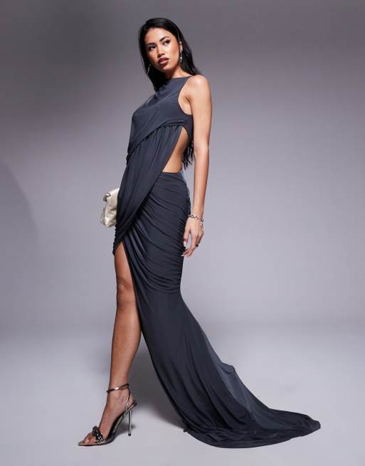ASOS DESIGN – Mörkgrå, åtsmitande maxiklänning med hög ringning och utskurna detaljer