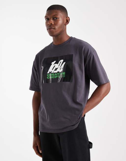ASOS DESIGN – Mörkgrå, avslappnad t-shirt med streettryck i vinylstil