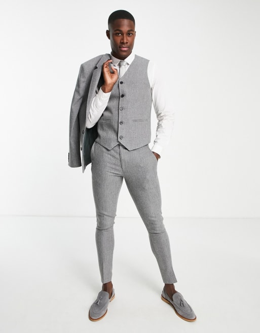 ASOS DESIGN – Mörkgrå fiskbensmönstrad kostym av yllemix med supersmal passform